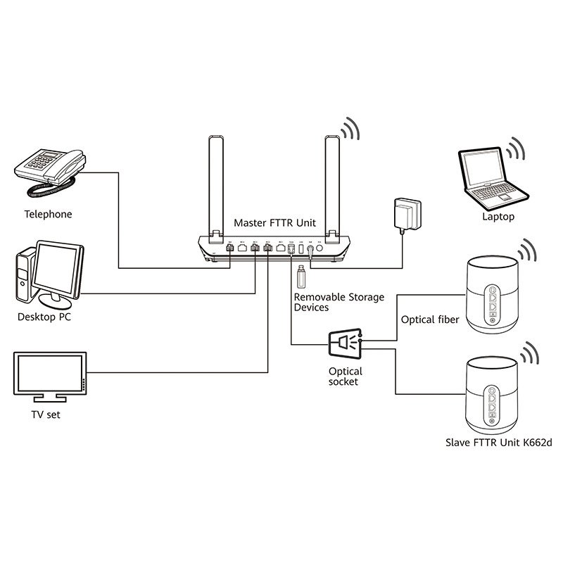 The K662d is crafted to complement the master FTTR HN8145XR, working in tandem within the FTTR home solution scenario. Its integration into a comprehensive all-optical system ensures optimized ultra-broadband access, making it ideal for modern households demanding reliable, gigabit-level service. This desktop slave FTTR uses optical fibers or Ethernet upstream transmission to achieve consistent, stable connectivity, empowering users with dual-band Gigabit Wi-Fi 6 and gigabit network capabilities.